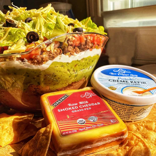 This hearty, flavor-packed dip brings together layers of guacamole, salsa, seasoned beef, and refried beans, made extra creamy with our tangy Creme Kefir and topped with bold Organic Raw Milk Smoked Cheddar. It’s a fresh take on a classic 7 layer dip using real, everyday ingredients you can feel good about.