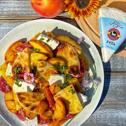 Grilled Peaches and Pineapple with Bella Capra Goat Feta is a sweet and savory combo perfect for summer. The warm, caramelized fruit pairs beautifully with the creamy tang of our goat feta, served alongside grilled naan and salami for an easy, flavorful platter.