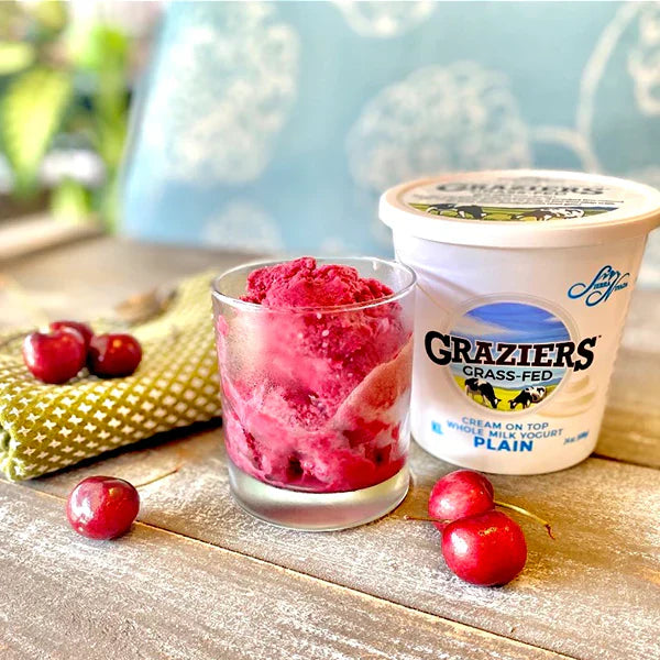 Bing Cherry Frozen Yogurt blends ripe cherries with our tangy Farmhouse Organic Crème Fraîche and creamy Graziers Cream-on-Top Yogurt for a refreshing, naturally sweet treat. It’s a simple homemade dessert with vibrant flavor and a smooth, satisfying texture—perfect on its own or served as a float with lime soda.