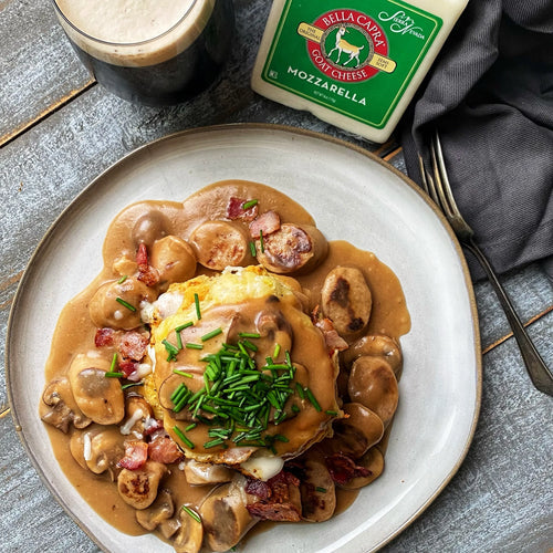Boxty and Bangers with Guinness Mushroom Gravy is a hearty, Irish-inspired dish made with crisp potato pancakes mixed with our Bella Capra Goat Mozzarella and Graziers Salted Butter. Topped with savory bangers in a rich mushroom Guinness gravy, it’s a flavorful comfort meal made with real, satisfying ingredients.