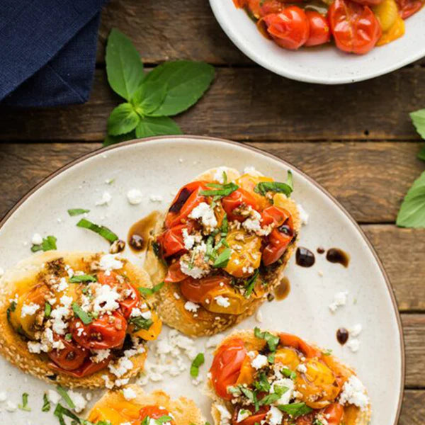 Burst Tomato Crostini is a simple yet flavorful appetizer made with sweet, blistered cherry tomatoes, fresh basil, and crumbled Bella Capra Goat Feta—all layered over buttery toasted baguette and finished with a tangy balsamic reduction. It’s an easy way to enjoy peak-season tomatoes in a dish that feels both rustic and refined.