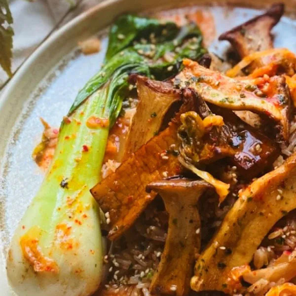 Buttered Kimchi is a quick and flavorful way to add bold flavor to your bowl, made by sautéing tangy kimchi with rich Graziers Grass Fed Butter. Served over jasmine rice with pan-seared trumpet mushrooms and steamed bok choy, it’s a simple yet satisfying meal with savory depth and a spicy kick.