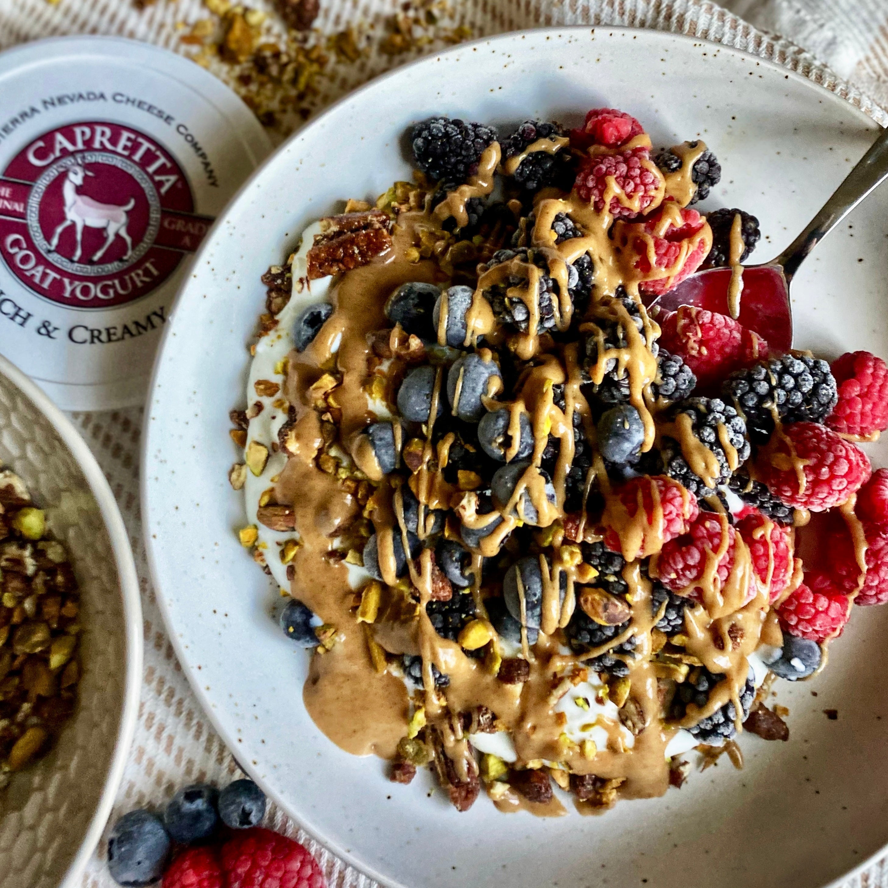 Capretta Goat Yogurt Bowl is a refreshing, protein-packed treat layered with frozen berries, salty pistachios, sweet candied pecans, and a rich almond butter drizzle. Simple to prep and endlessly customizable, it’s perfect for a nourishing breakfast or a wholesome afternoon snack.