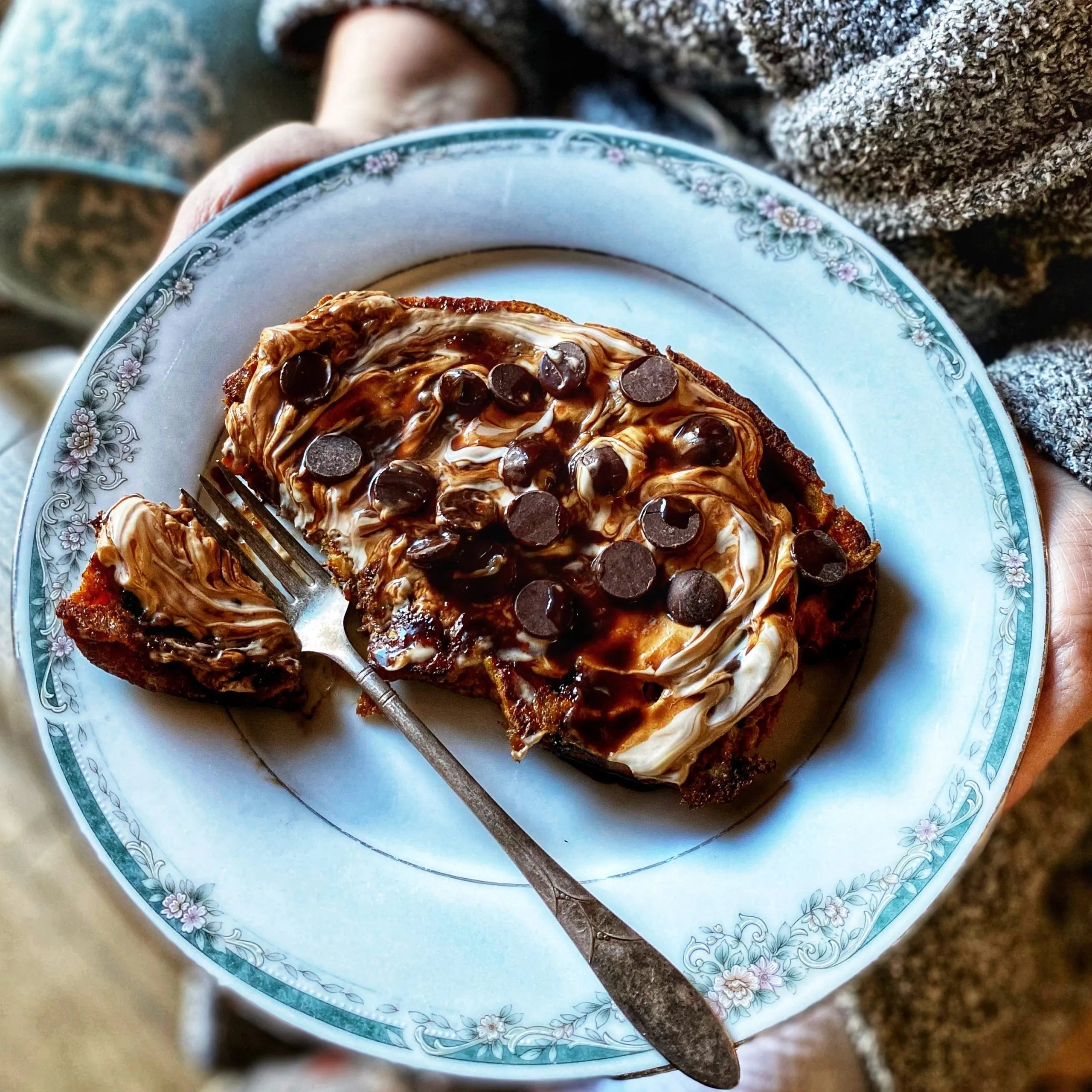 Rich and indulgent, this French toast made with panettone is crisped to golden perfection in butter, then topped with a swirl of crème fraîche, melted chocolate chips, and a drizzle of chocolate syrup.
