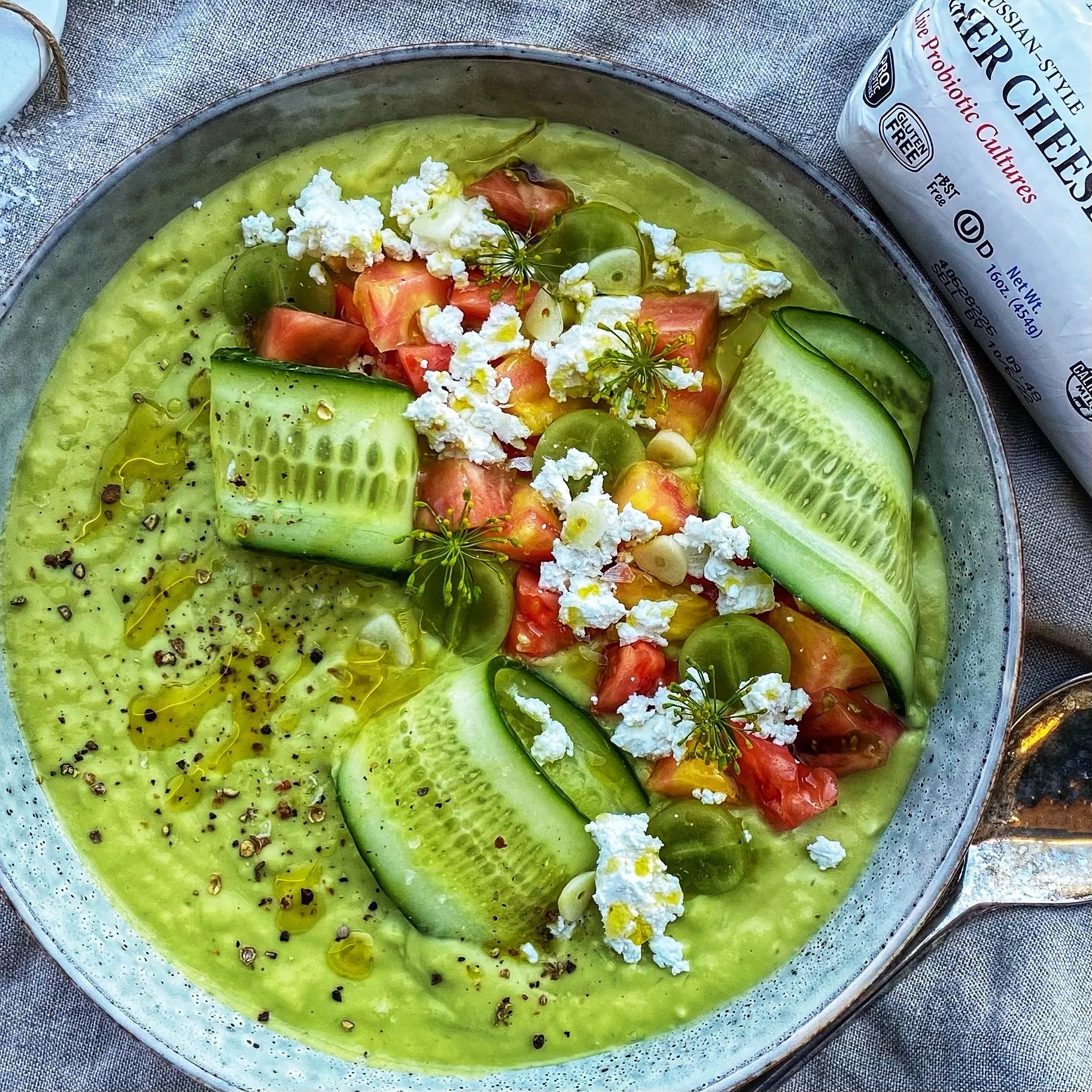 A cool and velvety blend of Gina Marie Farmer Cheese, ripe avocado, and crisp cucumber—this gazpacho is smooth, refreshing, and topped with juicy grapes, tomatoes, and a drizzle of olive oil. A perfect no-cook dish for warm weather.