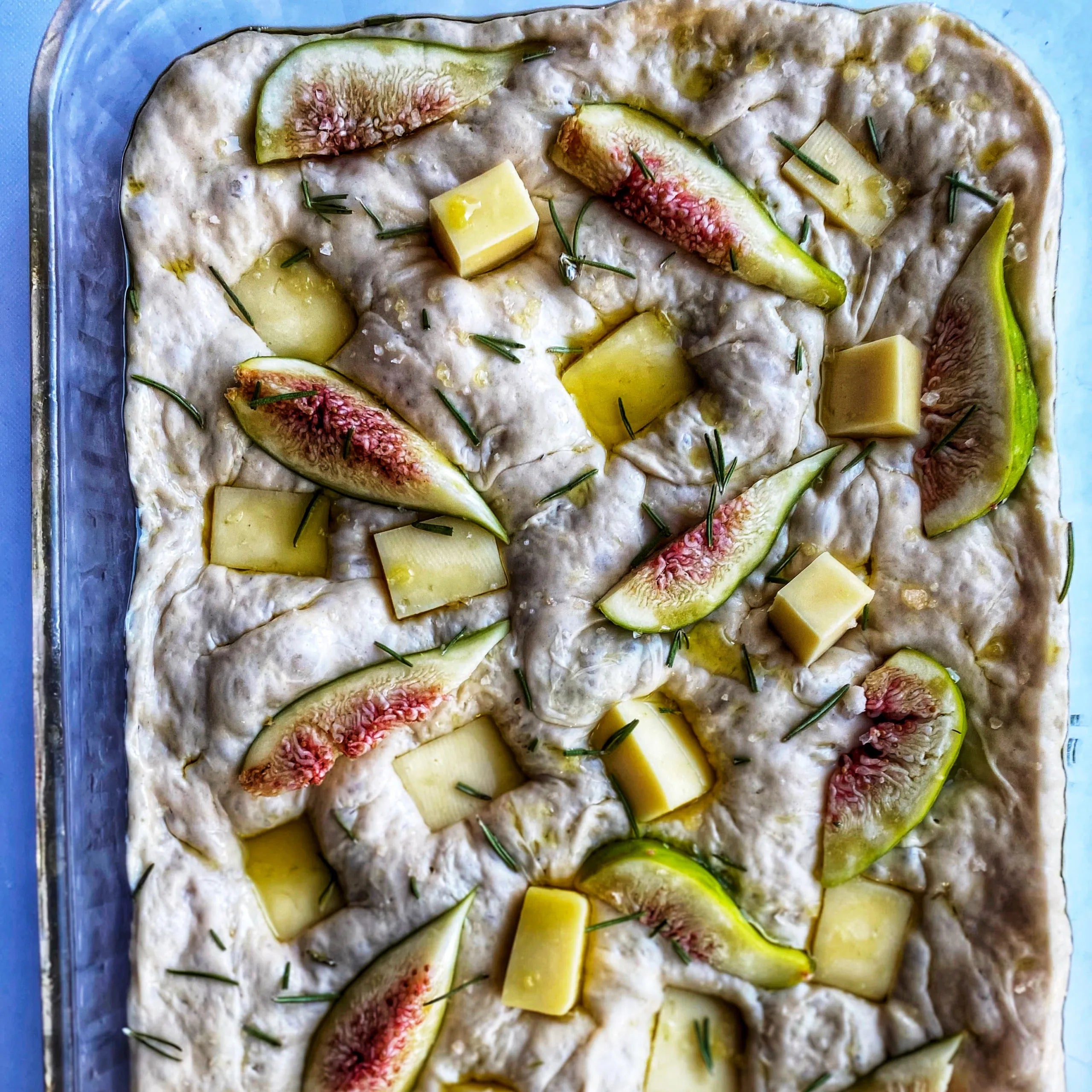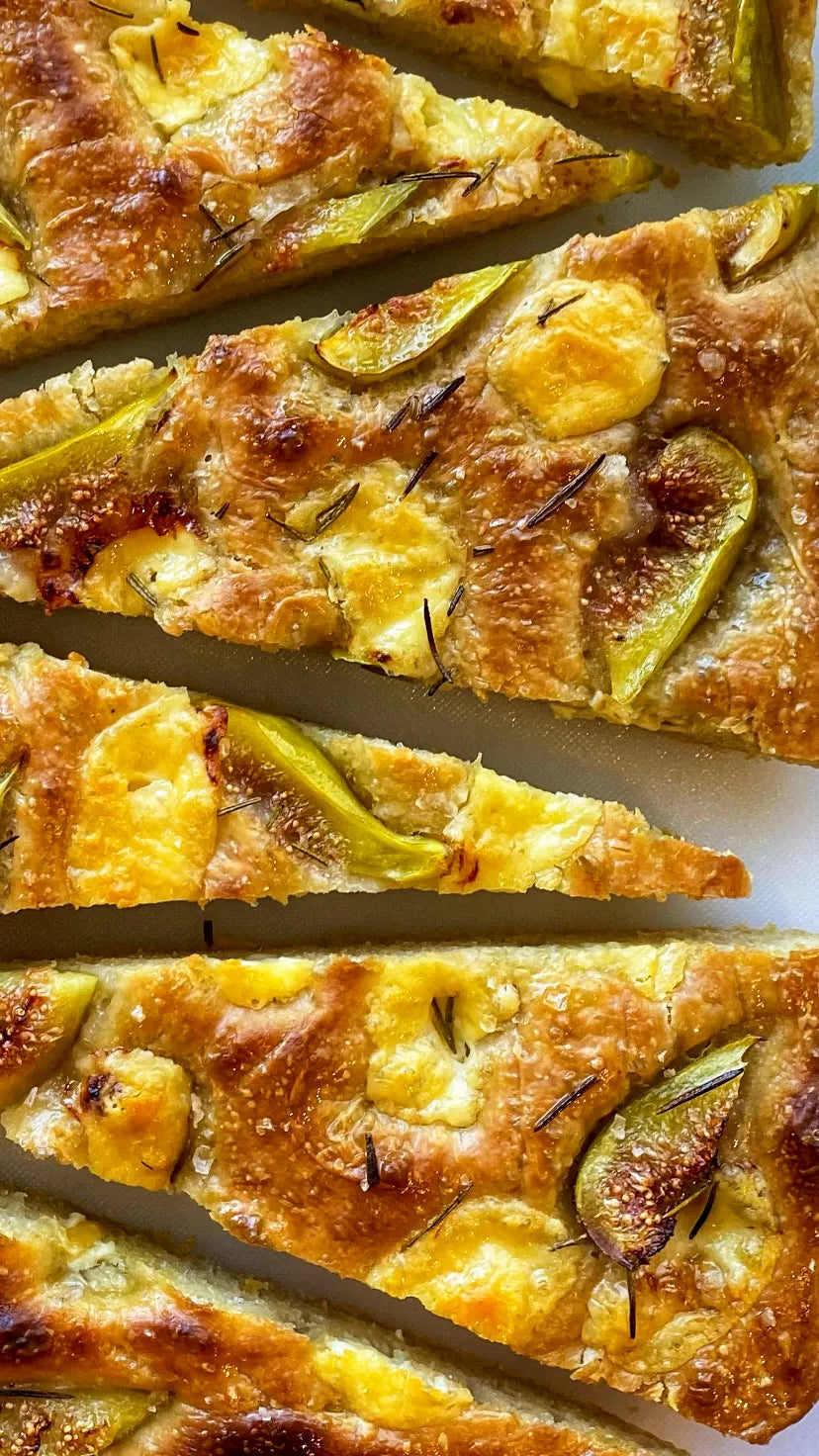 A beautifully airy focaccia topped with cubes of rich Graziers Cheddar, sweet figs, rosemary, and flaky salt. The long rise and generous olive oil soak make for a golden, flavorful crust—perfect served warm or at room temp.