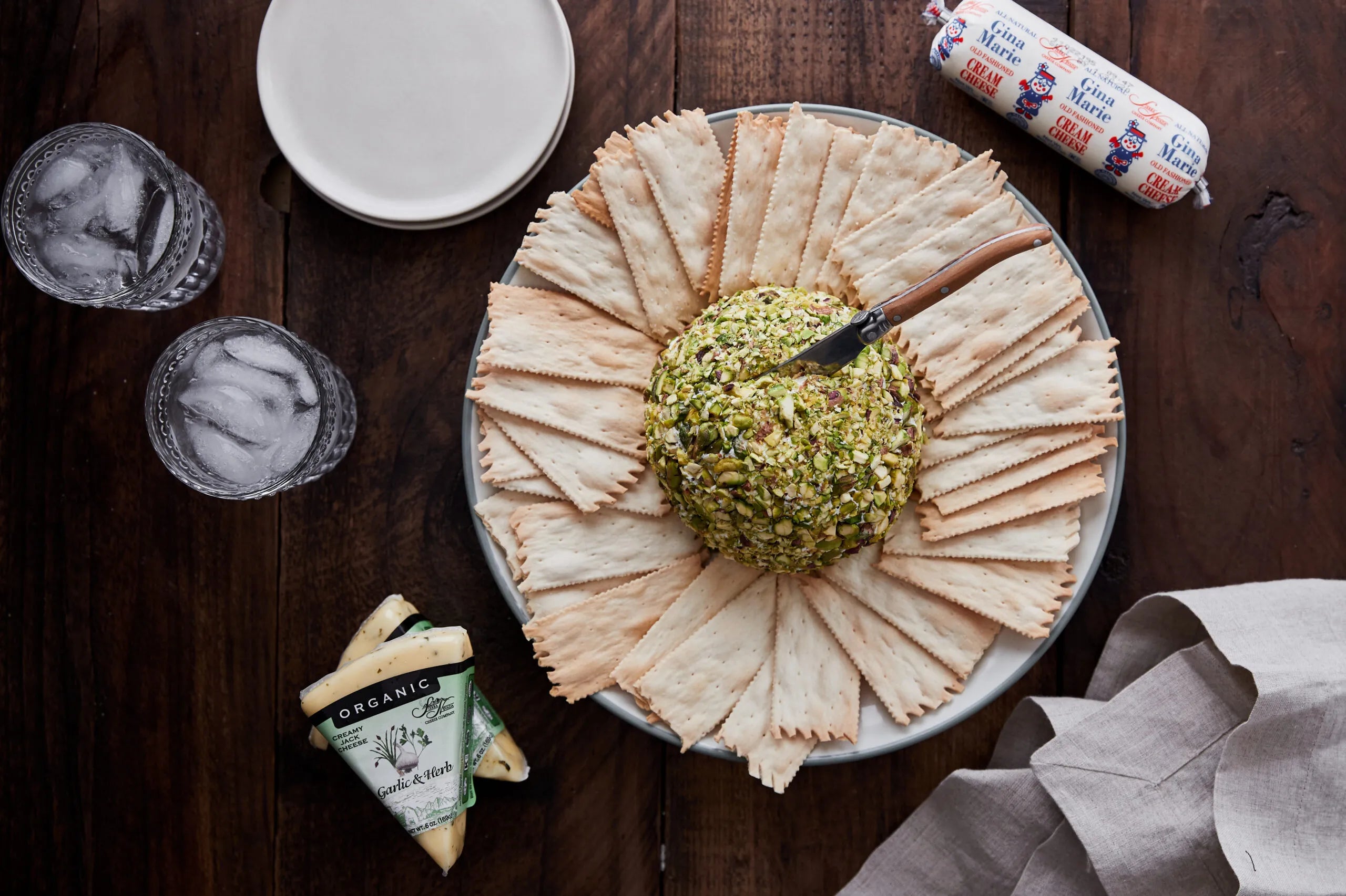 This Garlic & Herb Cheese Ball blends creamy Gina Marie Cream Cheese with shredded Organic Garlic & Herb Jack and a touch of black pepper, then gets rolled in toasted pistachios for a crunchy finish. It’s a flavorful, crowd-pleasing appetizer perfect for pairing with crackers or fresh bread.