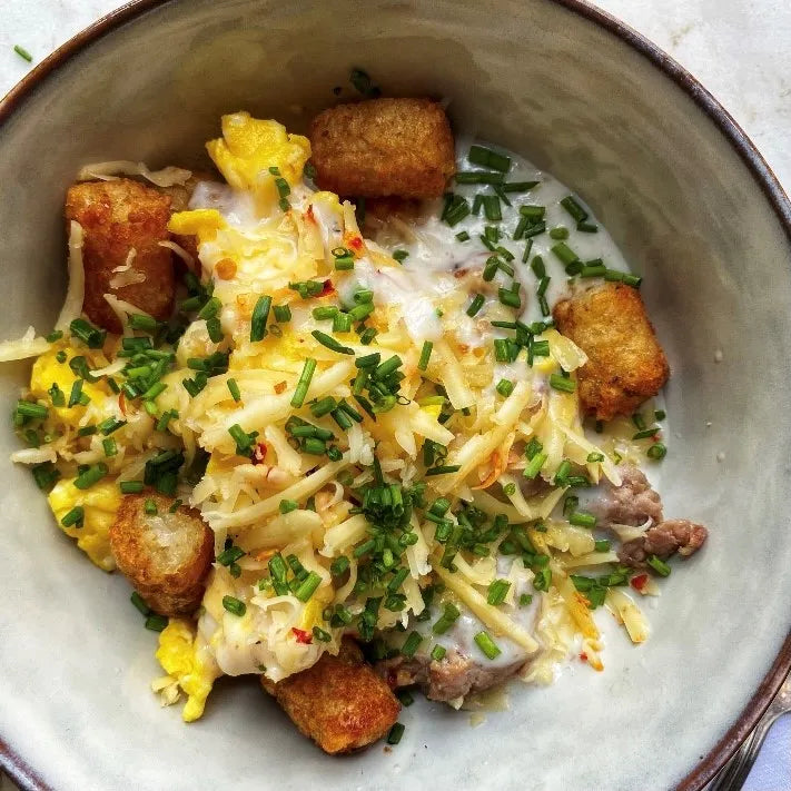 Jalapeño Jack Breakfast Bowls are a hearty, flavorful way to start the day—layering crispy tater tots, creamy country gravy, fluffy eggs, and savory sausage, all topped with melted Organic Jalapeño Jack. Finished with fresh chives, it's a satisfying breakfast made with real, everyday ingredients.