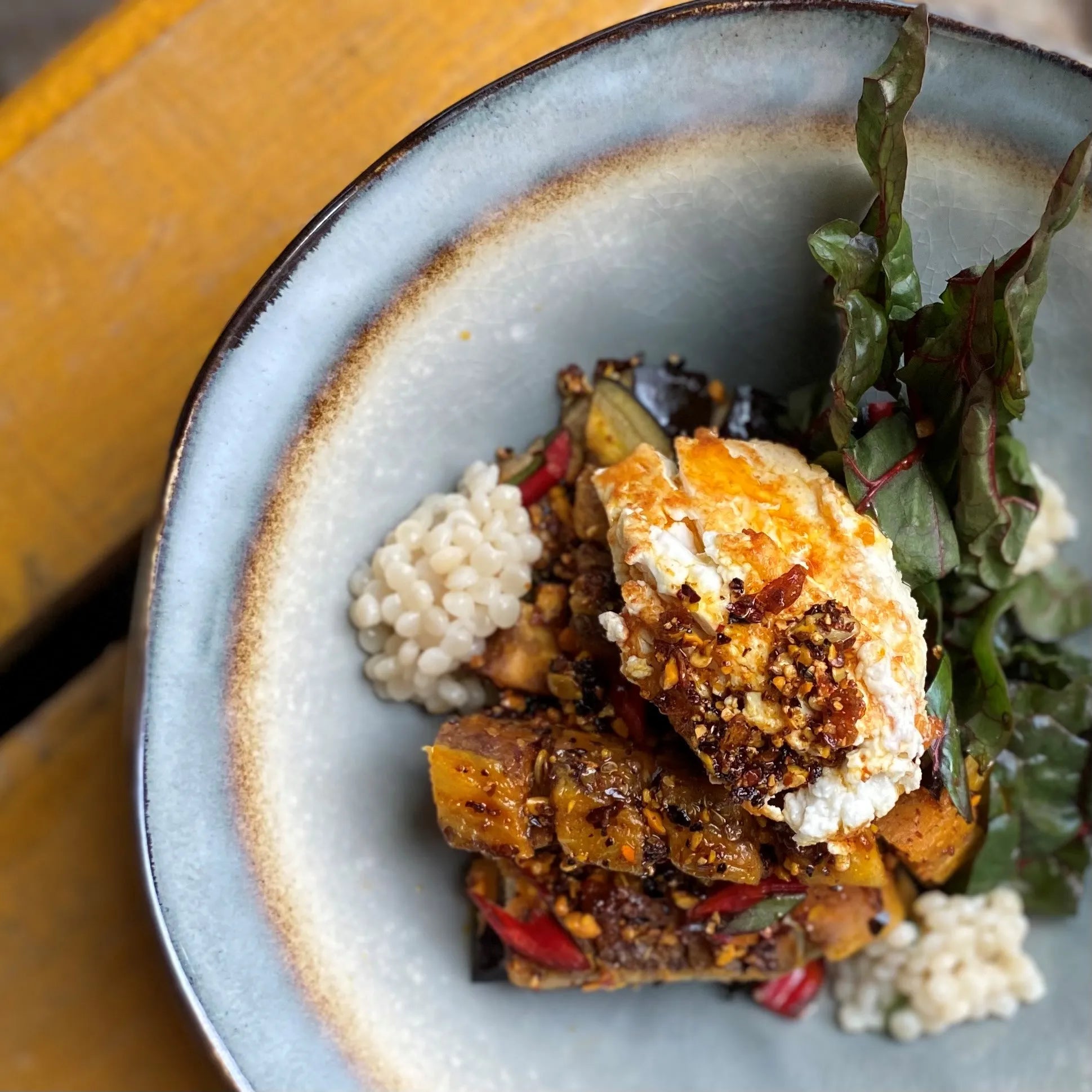 Pan Seared Feta and Roasted Eggplant Salad is a bold, savory dish featuring tender roasted eggplant brushed with chili crisp, topped with crispy Bella Capra Goat Feta, sautéed Swiss chard, and a scoop of pearl couscous. It’s a vibrant, satisfying plate with layers of texture and flavor.