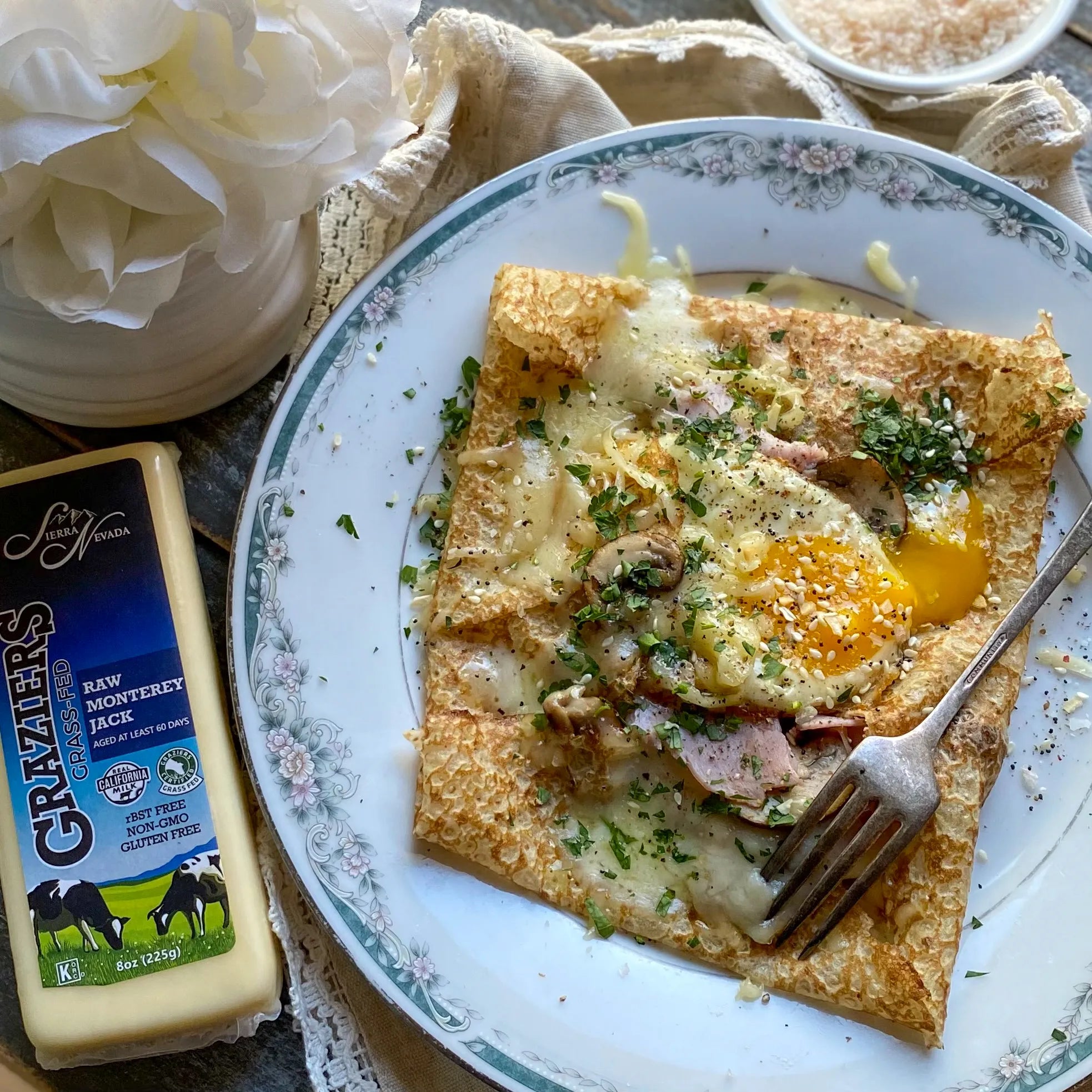 A golden crepe made with Graziers Vat Cultured Euro-Style Butter filled with a sunny-side-up egg, sautéed ham and mushrooms. Topped with shredded Graziers Raw Milk Monterey Jack cheese and fresh herbs, then partially folded to showcase the creamy yolk. The buttery crepe's crispy edges provide the perfect contrast to its savory filling.