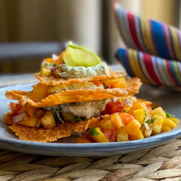 These Hatch Chile Cheese Crisp Stacks layer crispy baked Sierra Jack Hatch Chile with a creamy blend of Gina Marie Farmer Cheese and Organic Crème Fraîche, topped with a vibrant peach-pineapple salsa. Bright, tangy, and full of texture, it’s a colorful appetizer or sharable dish with bold summer flavor.