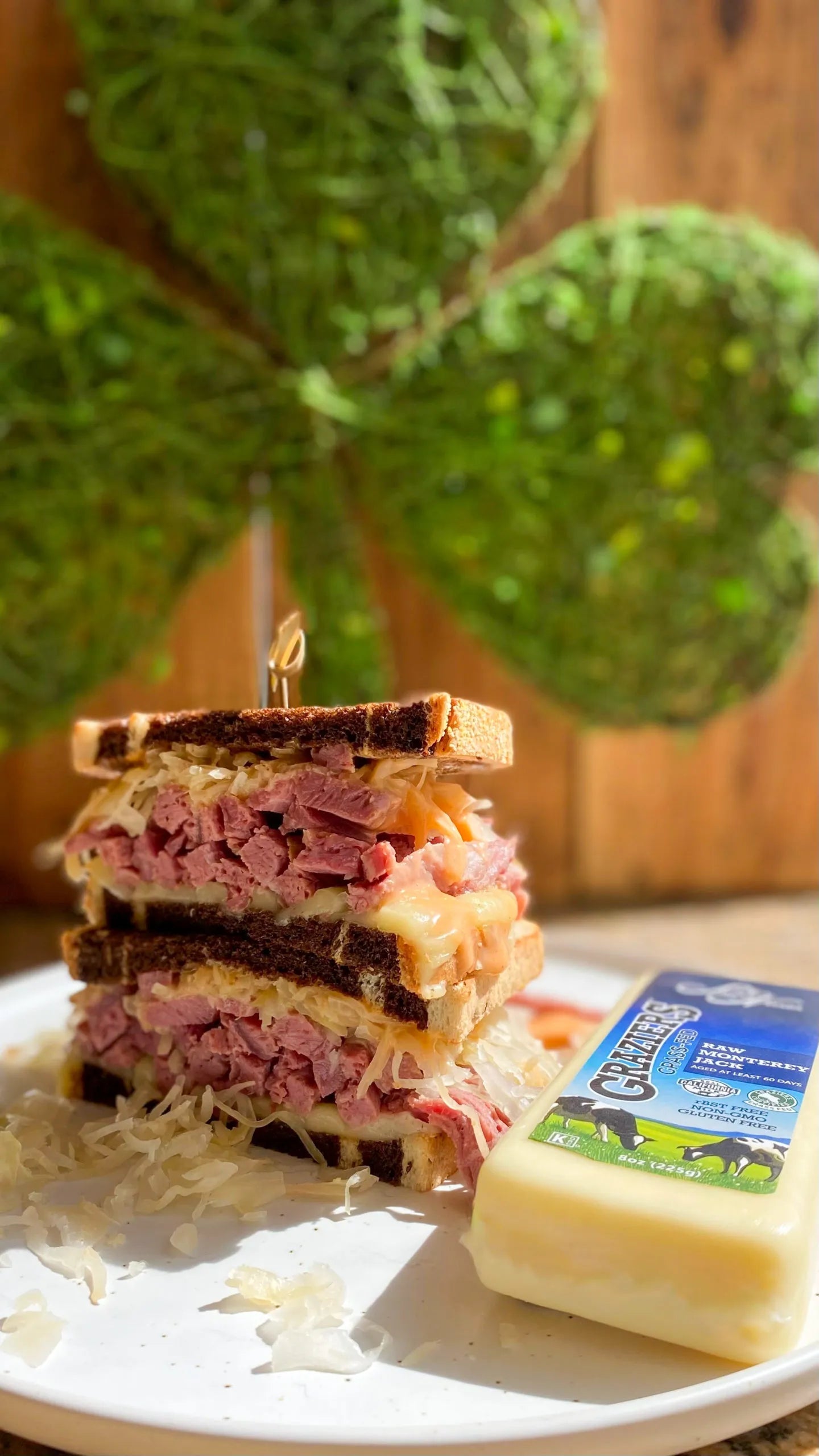 St. Patrick’s Day Reuben Sandwich is a bold, cheesy take on the classic deli favorite featuring corned beef, tangy sauerkraut, thousand island dressing, and melty Monterey Jack on toasted marbled rye.