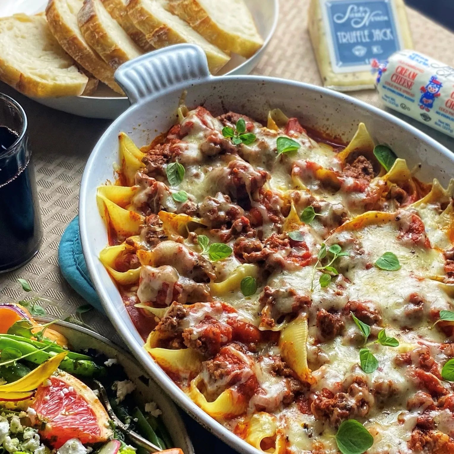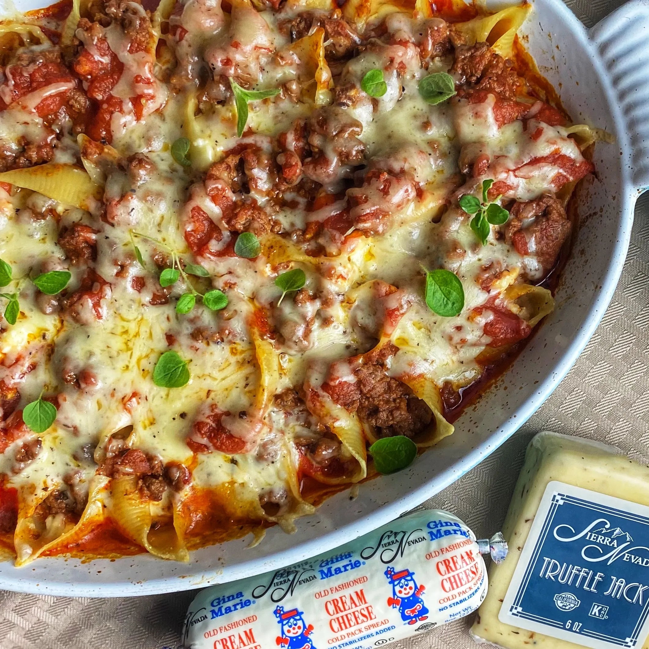 Stuffed Shells with Truffle Jack and Gina Marie Cream Cheese are a rich, comforting baked pasta dish layered with savory beef marinara and filled with a creamy blend of truffle-scented cheese. Finished with a bubbly, golden top, it’s an elevated take on a family favorite using real, flavorful ingredients.