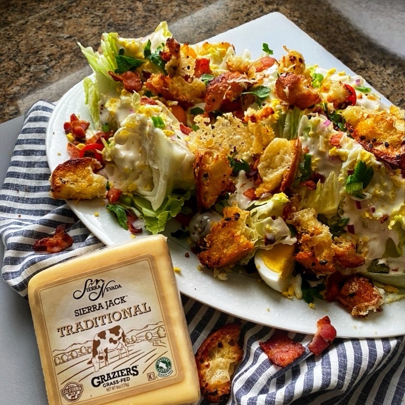 Ciabatta Jack Croutons are a flavorful, crunchy salad topper made by tossing torn ciabatta bread with olive oil, garlic, and a generous handful of shredded Sierra Traditional Jack. Baked until golden and crisp, they add a cheesy, savory crunch to any dish.